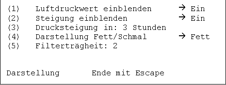 Nach Drücken der Taste 3 (Darst.) können Einstellungen zur Darstellung gewählt werden. Durch Betätigen der Taste mit der entsprechenden Ziffer wird dann dieser Einstellungspunkt verändert.